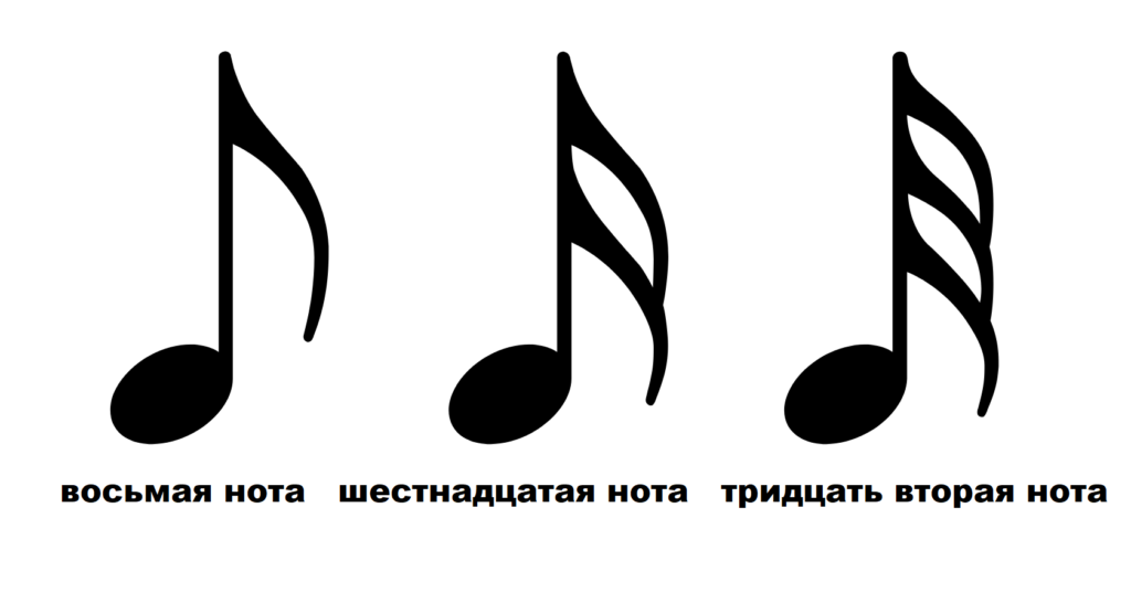 Добавление дополнительного хвостика к основе ноты снижает ее длительность вдвое.