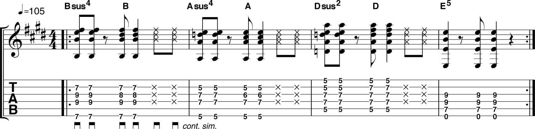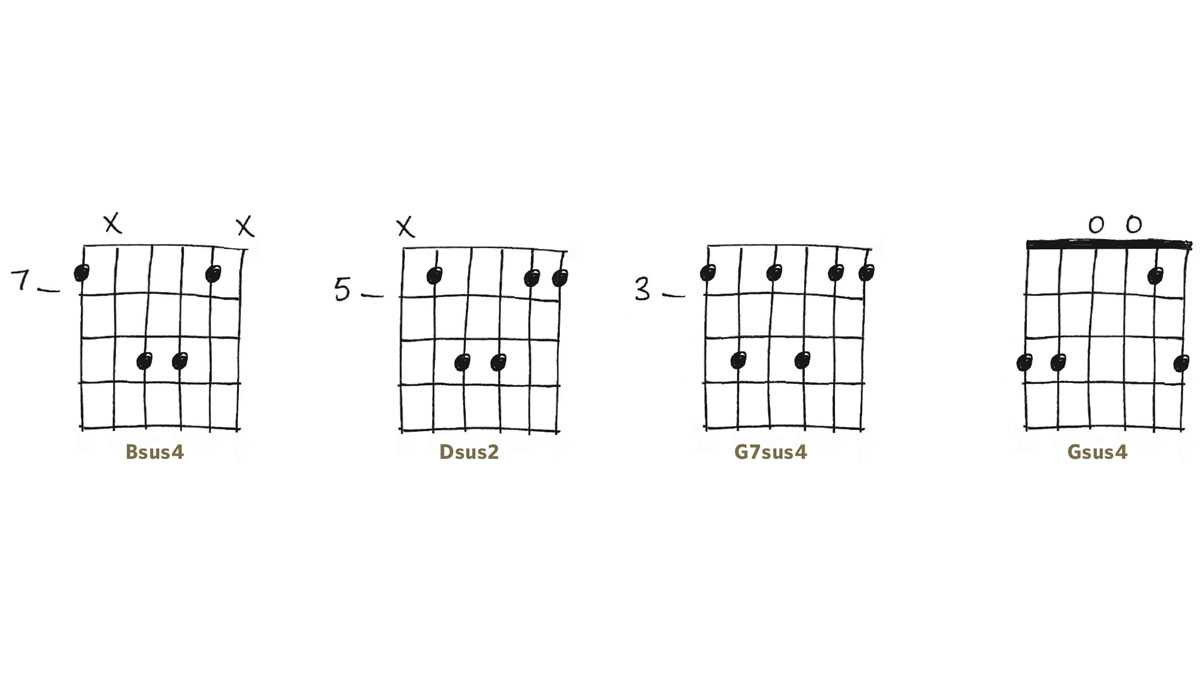 Аккорды Sus всегда будут хорошо звучать перед аналогичными минорными или мажорными аккордами: Bsus4 перед B, Dsus2 перед D и т.д.