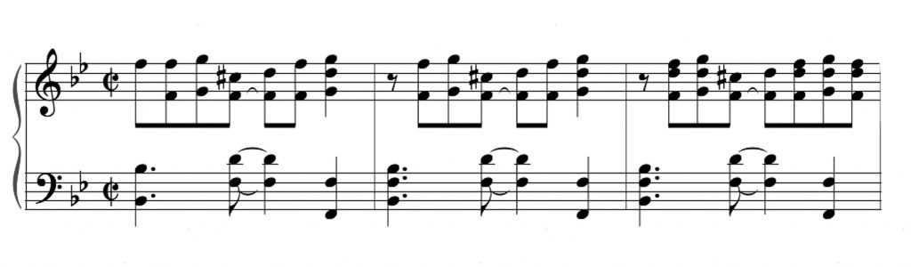 Это заставило ритм качать еще сильней, а в купе с синкопой Бади Болдена привело музыкантов на мысль, что если синкопировать и опираться не на первую и третью доли такта, тогда можно заставить ритм «качаться». А если качается ритм, то и качаются люди в такт и пританцовывают. В итоге получился вот такой вот вариант: