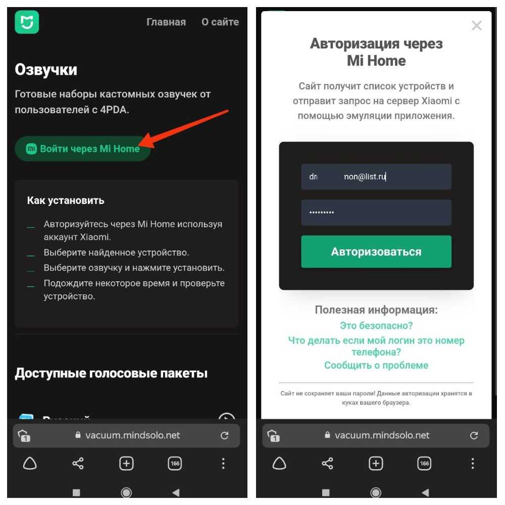3 Нажимаем кнопку «Войти через MiHome» — на этом этапе понадобится ввести на сайте ваш логин и пароль от MiHome, по заявлению разработчика сайт не собирает и не хранит пароли, но если вы переживаете за приватность, всегда можно поменять пароль в MiHome после установки озвучки.