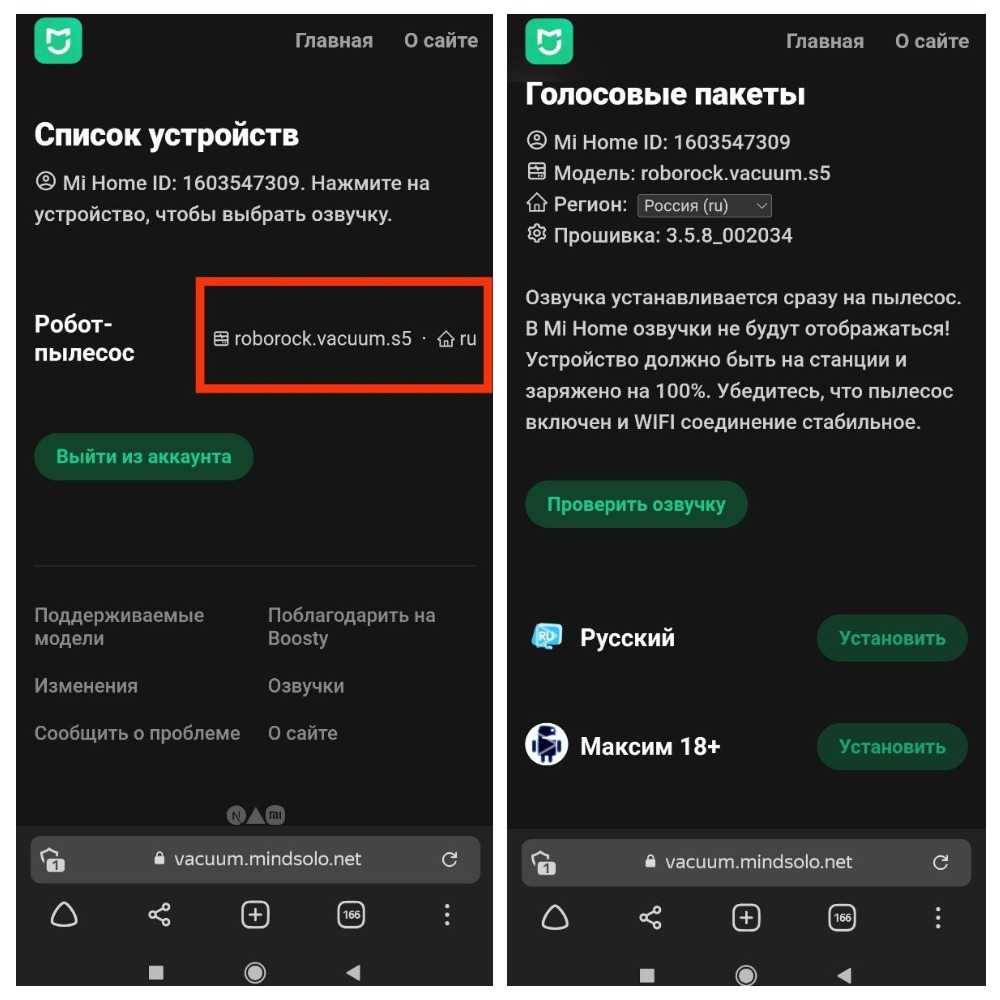 4 После ввода данных, отобразится список роботов пылесосов подключенных к данному аккаунту. Кликаем на робот пылесос и получаем список доступных озвучек для вашей модели.