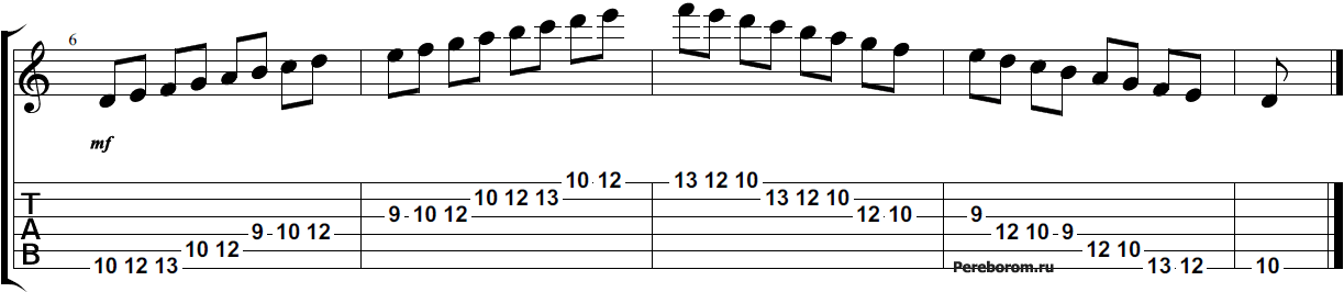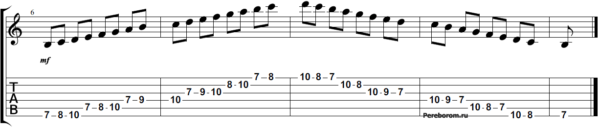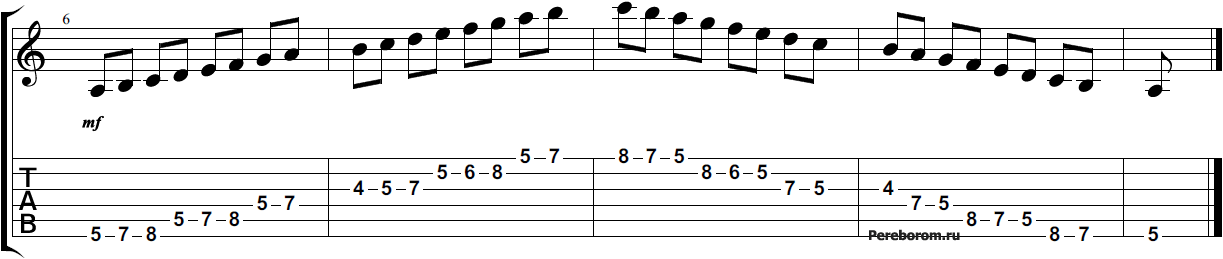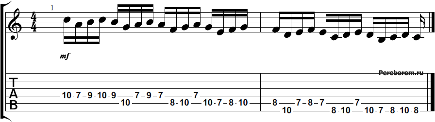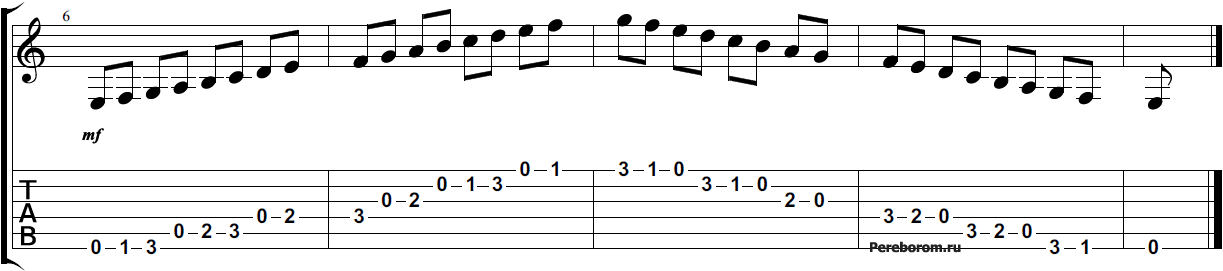 Похожее на предыдущее упражнение, разница лишь в том, что тут задействованы все струны, а также гамма восходящая, а не нисходящая. Кроме этого, в некоторых местах вам потребуется использовать прием легато для того, чтобы переход между нотами был плавным.