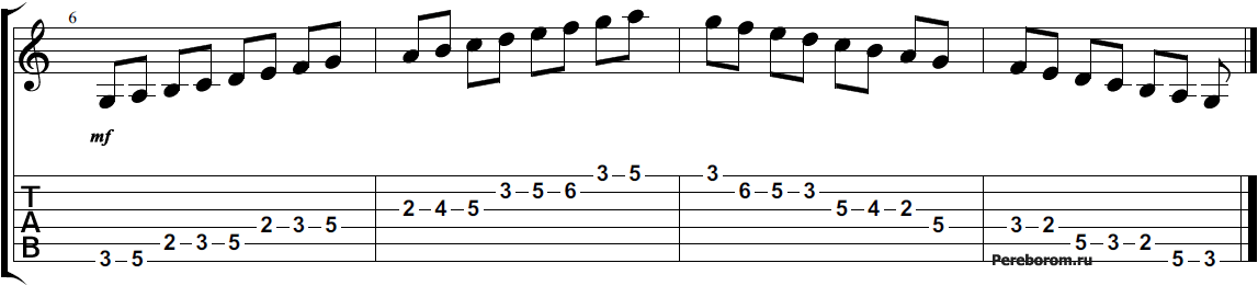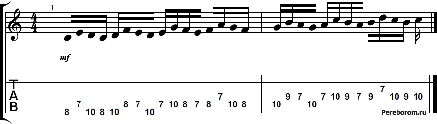 Ниже представлены несколько упражнений для отработки гаммы до-мажор. Вместе с подробным описанием также идут табы и аудиодорожки, где можно будет более подробно их разобрать. Кроме того, все эти упражнения можно перенести и на другие тональности без каких-либо проблем.