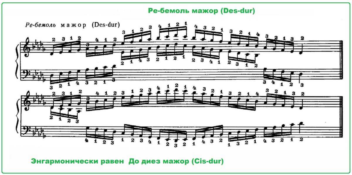 Черным отмечена тоника данной гамы, арабские цифры как обычно отмечают номера пальцев левой руки, а римские цифры внизу схемы — номера ладов.