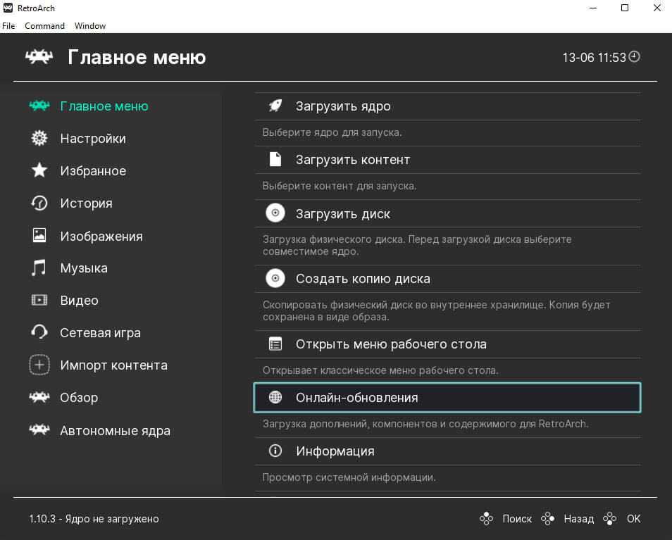 - Когда ваши ROM-файлы добавлены в Retroarch, вернитесь в меню «Онлайн-обновления».