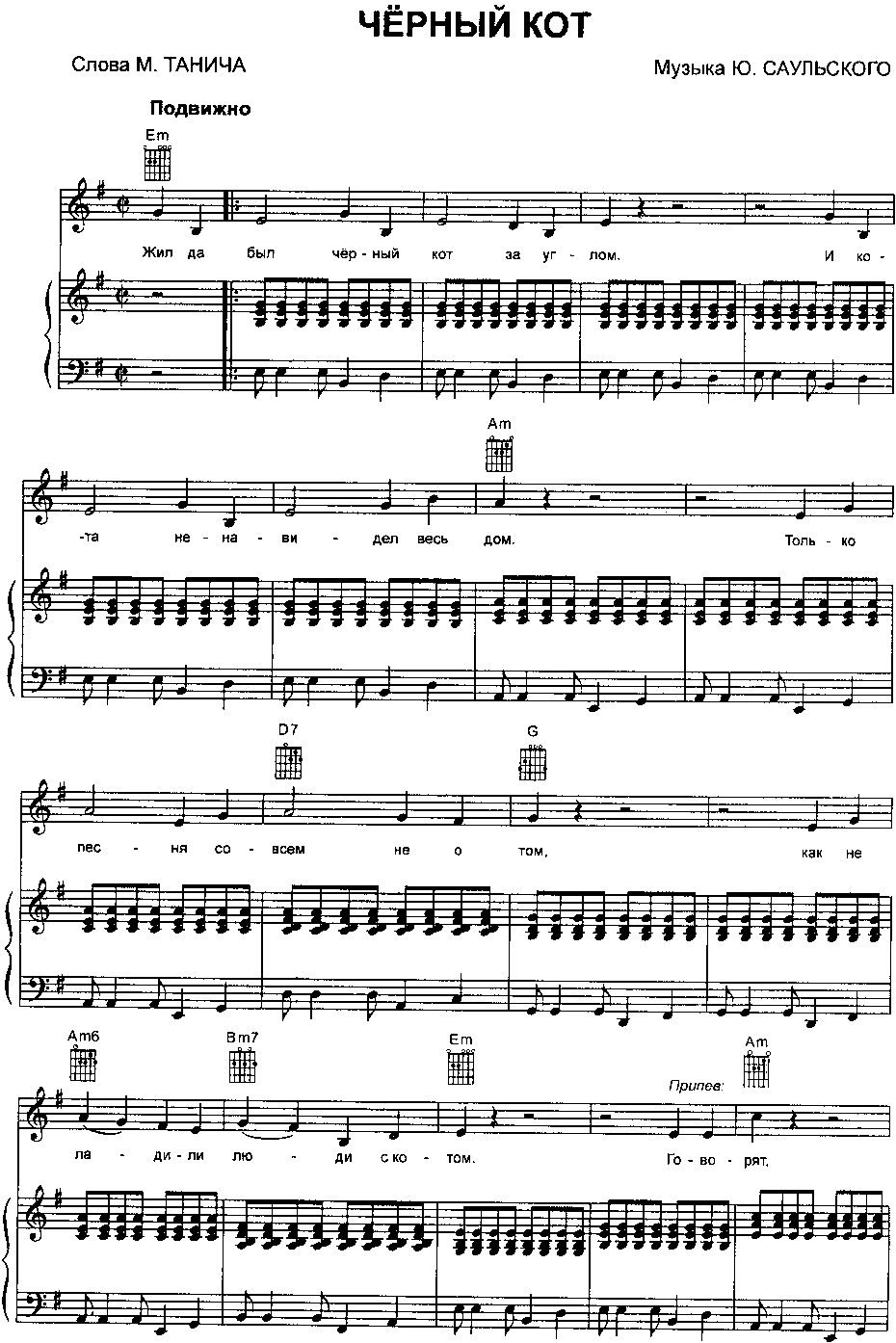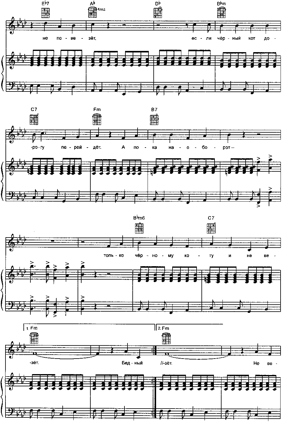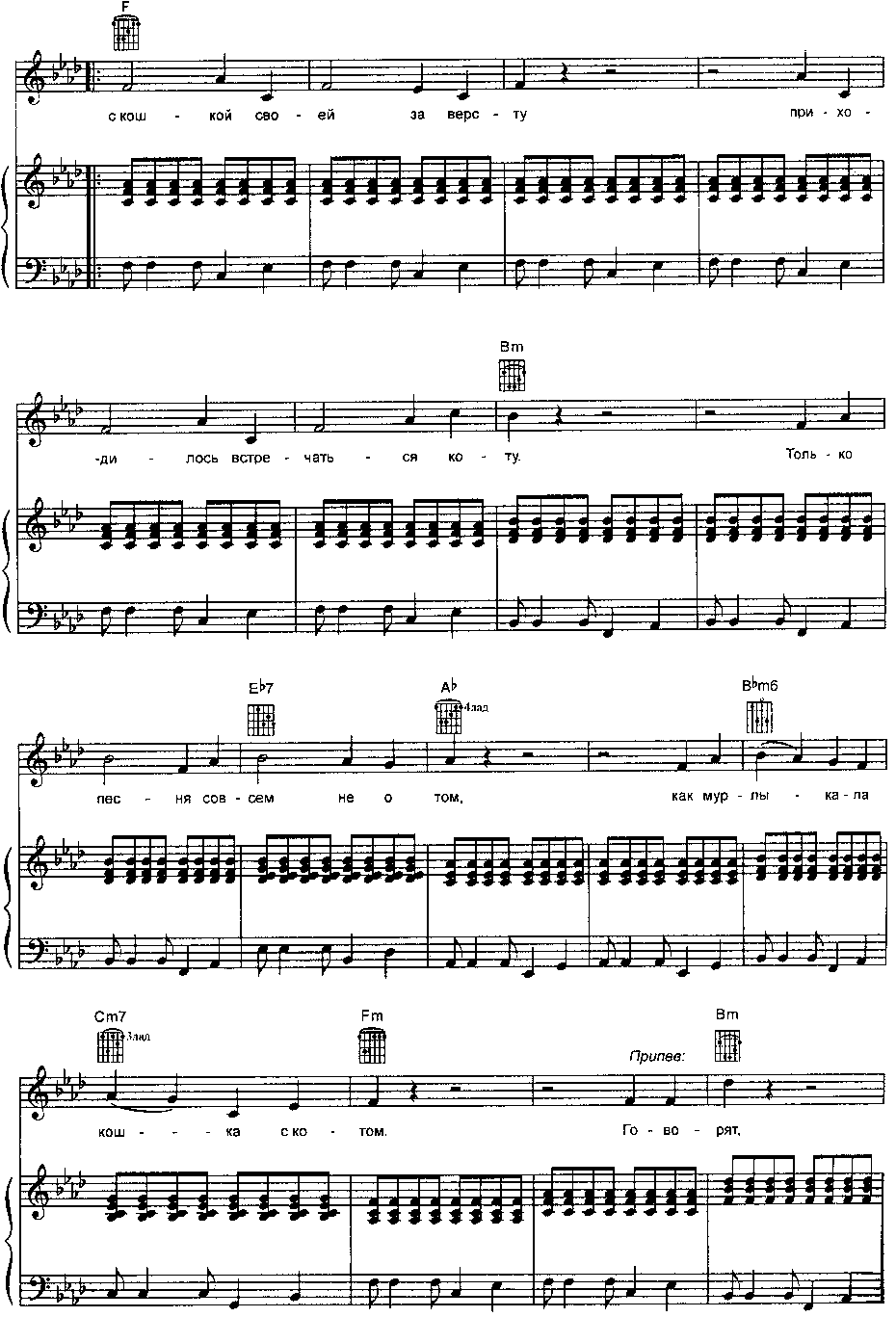 B(A)…………………………F(E) Я пушистый беленький котёнок, B(A)……………………..F(E) Не ловил ни разу я мышей, Eb(D) Где бы я ни появился, B(A) Где бы ни остановился, F(E)…………………………..B(A) Слышу от больших и малышей: — Кис! Eb(D) Где бы я ни появился, B(A) Где бы ни остановился, F(E)…………………………..B(A) Слышу от больших и малышей: — Кис! Кис!