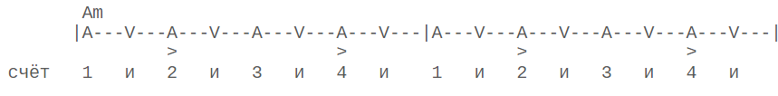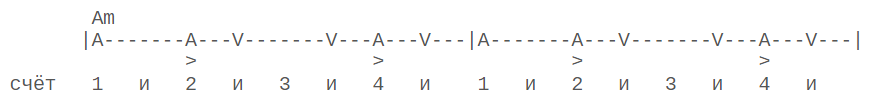 А (ля мажор). Состоит из нот ля, до-диез, ми. В нем тоже не участвует 6-я струна.