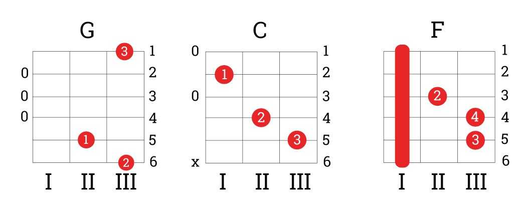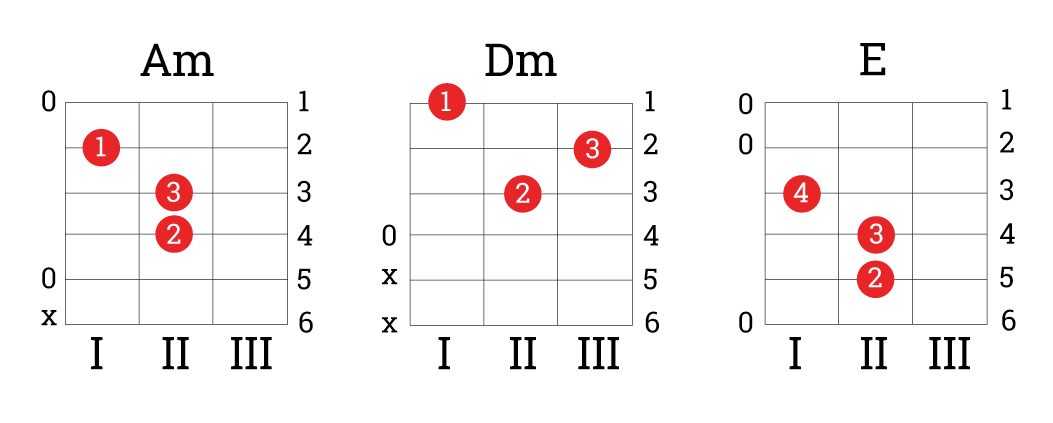 Этот способ игры задействует 4 струны — 3 верхние (ми, си, соль) и басовую. Вот несколько простых схем: