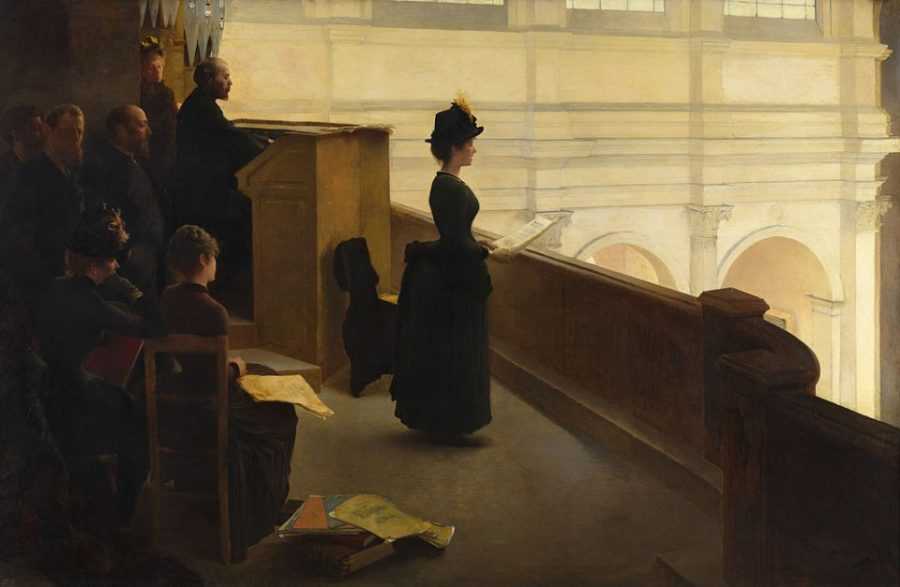 Такое же послание мы наблюдаем у Анри Лероля, французского художника-реалиста. Он написал «Репетицию с органом» примерно в то же время.