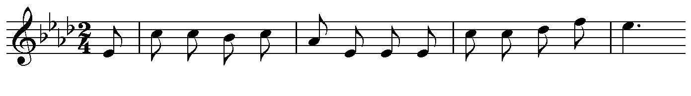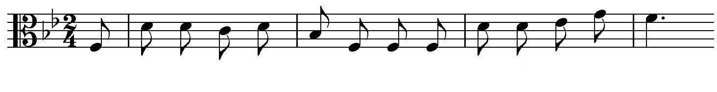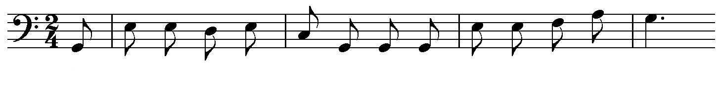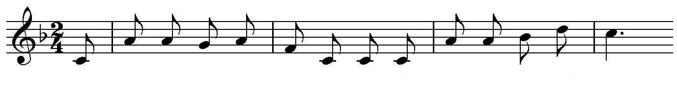 Мы будем переносить песню на большую терцию вниз. Желательно сразу определить новую тональность. Это сделать довольно просто – мы знаем исходную тональность, а поэтому знаем и тонику; переносим тонику на большую терцию вниз и попадаем на ноту Фа. Значит наша новая тональность – Фа-мажор. И теперь, когда мы перенесли все наши ноты на большую терцию вниз, наша песня стала звучать и выглядеть так: