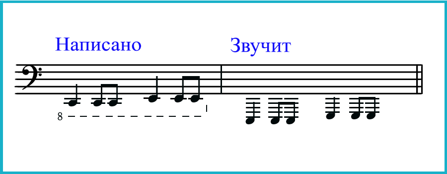 Если восьмерка и пунктир расположились под нотным станом, значит и играть следует на октаву ниже:
