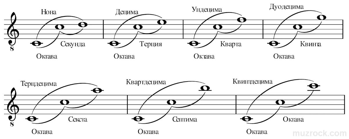 Чтобы не путаться в названиях, запомните, что децима – это 10 по-латински. Мы складываем первую часть слова со второй, а в итоге получаем количество ступеней. В ундециме – 11, в терцдециме – 13 и т. д. Названия первой половины слова совпадают с названиями простых интервалов.