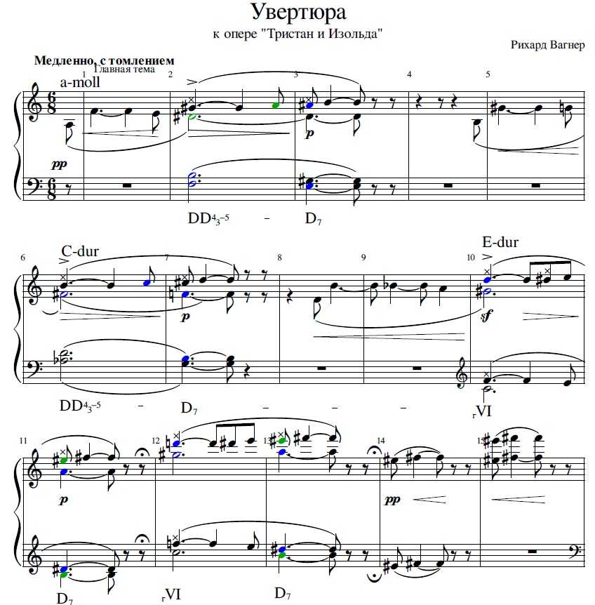 Увертюра к опере «Тристан и Изольда» особенно показательна с точки зрения особенностей романтической гармонии: неустойчивость, диссонансы (цветом выделены тритоны, иногда в такте встречается даже 3 тритона), обилие неаккордовых звуков (обозначены крестиками над нотами), альтерации, диссонирующие трезвучия — все это встречается даже в небольшом фрагменте, приведенном выше, музыка же просто завораживает!