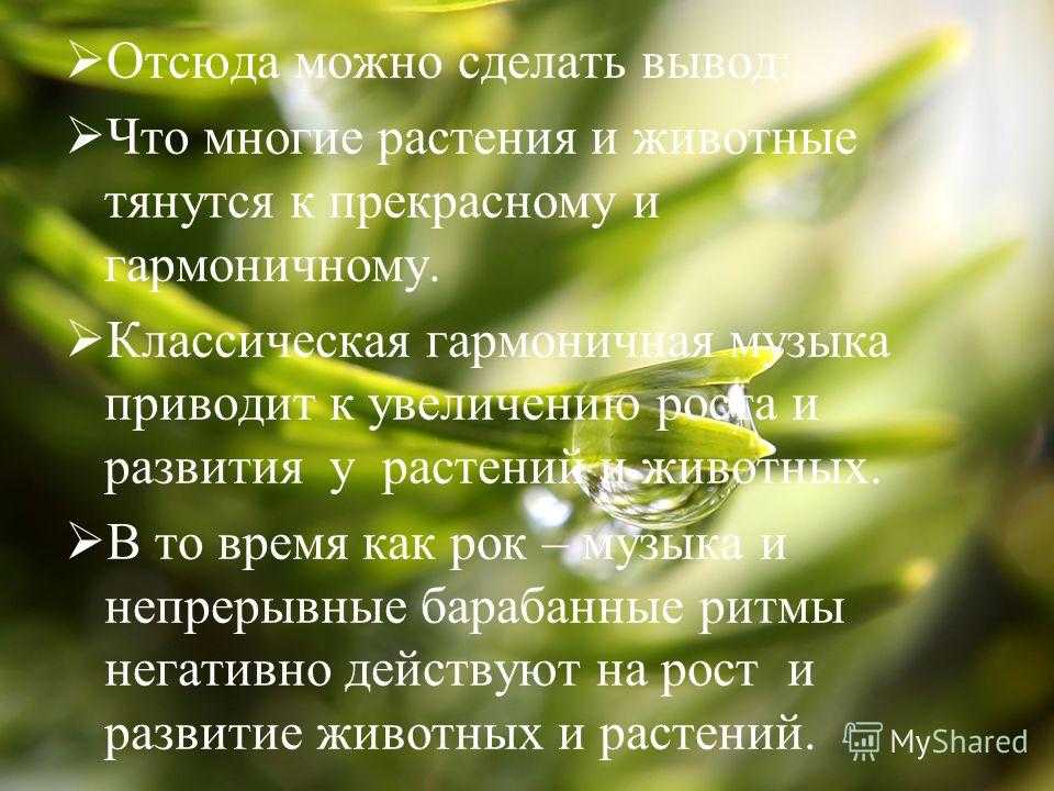 Отсюда можно сделать вывод: Что многие растения и животные тянутся к прекрасному и гармоничному. Классическая гармоничная музыка приводит к увеличению роста и развития у растений и животных. В то время как рок – музыка и непрерывные барабанные ритмы негативно действуют на рост и развитие животных и растений.