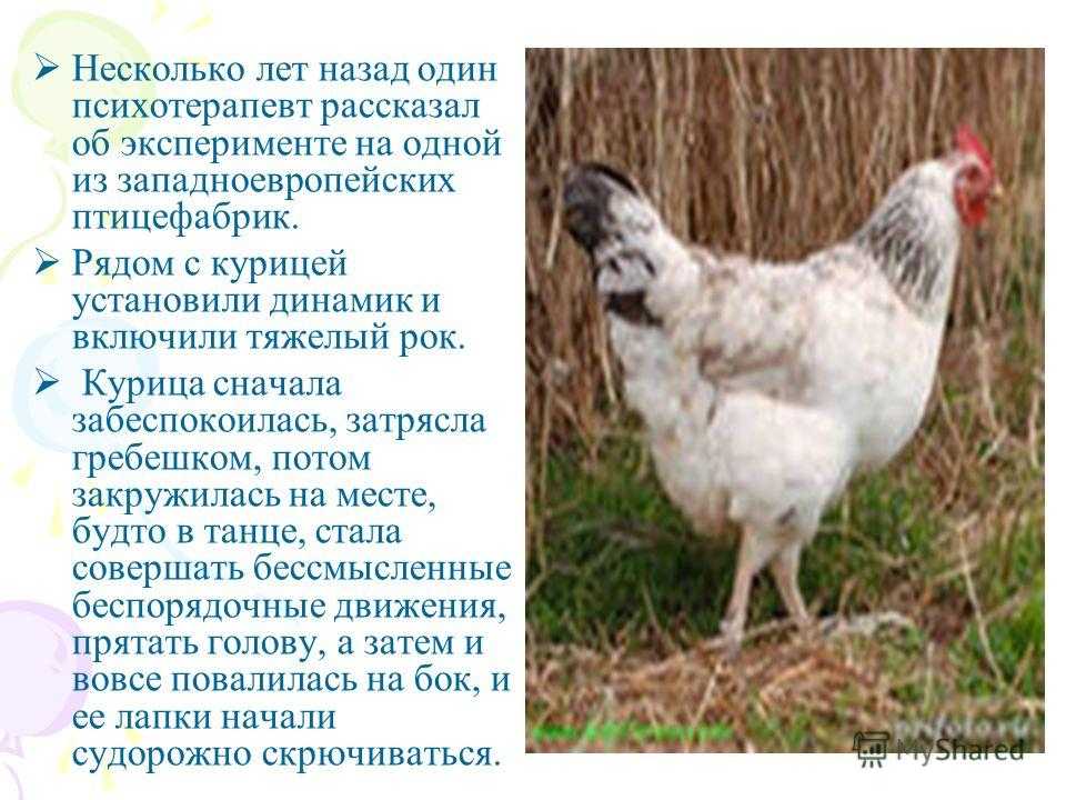Несколько лет назад один психотерапевт рассказал об эксперименте на одной из западноевропейских птицефабрик. Рядом с курицей установили динамик и включили тяжелый рок. Курица сначала забеспокоилась, затрясла гребешком, потом закружилась на месте, будто в танце, стала совершать бессмысленные беспорядочные движения, прятать голову, а затем и вовсе повалилась на бок, и ее лапки начали судорожно скрючиваться.