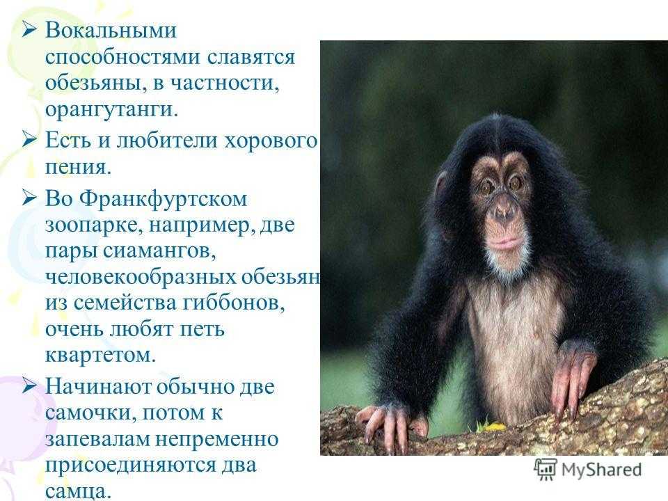 Вокальными способностями славятся обезьяны, в частности, орангутанги. Есть и любители хорового пения. Во Франкфуртском зоопарке, например, две пары сиамангов, человекообразных обезьян из семейства гиббонов, очень любят петь квартетом. Начинают обычно две самочки, потом к запевалам непременно присоединяются два самца.