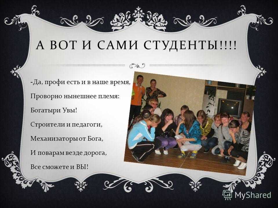 А ВОТ И САМИ СТУДЕНТЫ !!!! — Да, профи есть и в наше время, Проворно нынешнее племя : Богатыри Увы ! Строители и педагоги, Механизаторы от Бога, И поварам везде дорога, Все сможете и ВЫ !