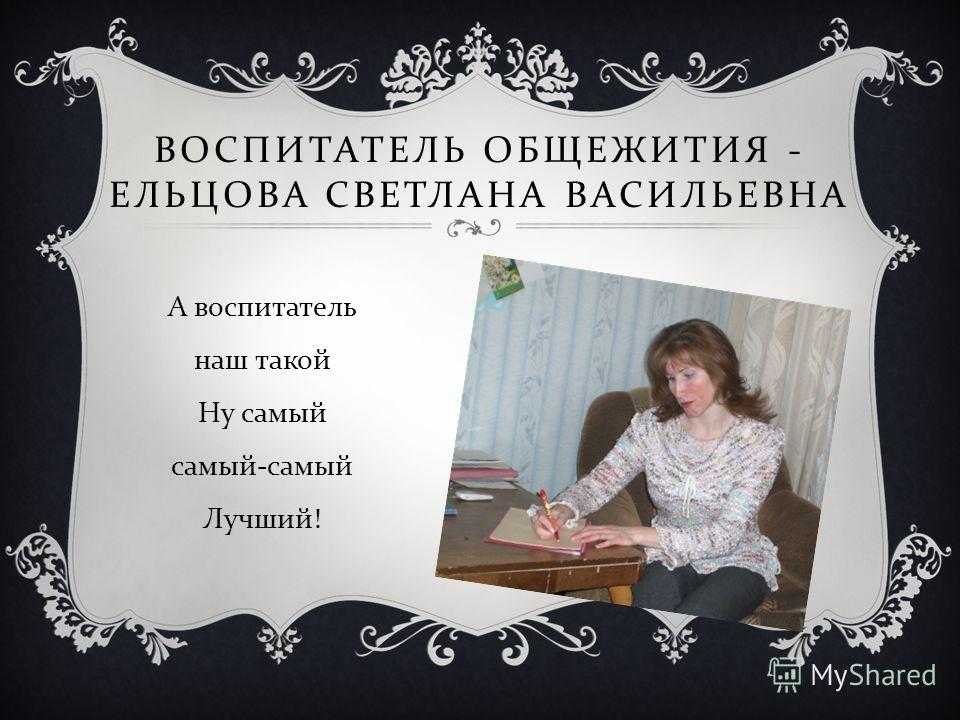 ВОСПИТАТЕЛЬ ОБЩЕЖИТИЯ — ЕЛЬЦОВА СВЕТЛАНА ВАСИЛЬЕВНА А воспитатель наш такой Ну самый самый — самый Лучший !