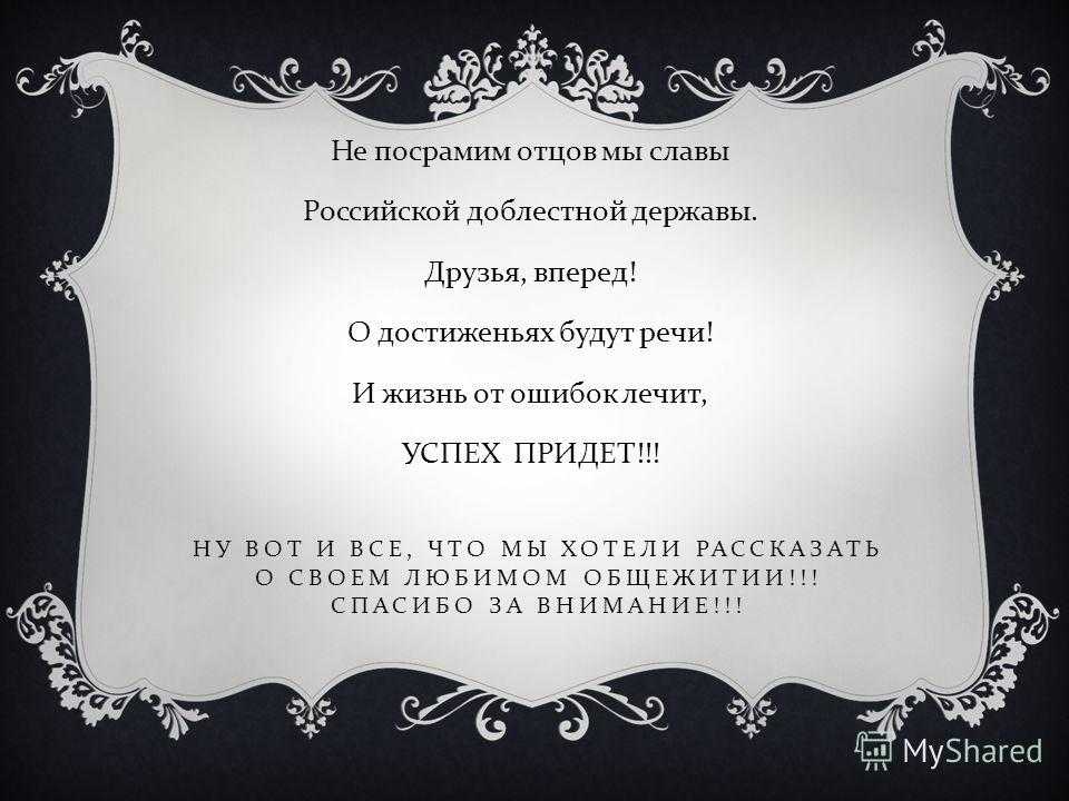НУ ВОТ И ВСЕ, ЧТО МЫ ХОТЕЛИ РАССКАЗАТЬ О СВОЕМ ЛЮБИМОМ ОБЩЕЖИТИИ !!! СПАСИБО ЗА ВНИМАНИЕ !!! Не посрамим отцов мы славы Российской доблестной державы. Друзья, вперед ! О достиженьях будут речи ! И жизнь от ошибок лечит, УСПЕХ ПРИДЕТ !!!
