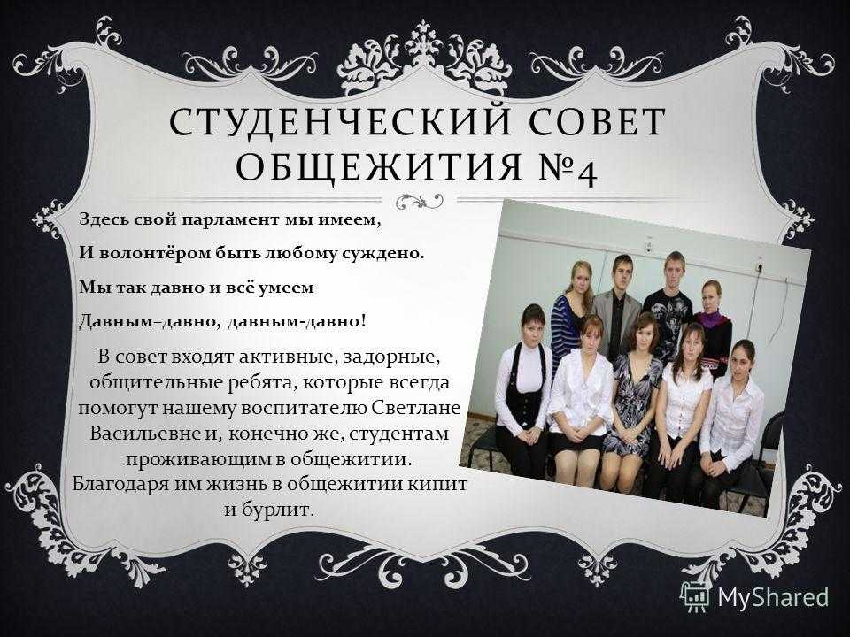 Здесь свой парламент мы имеем, И волонтёром быть любому суждено. Мы так давно и всё умеем Давным – давно, давным — давно ! СТУДЕНЧЕСКИЙ СОВЕТ ОБЩЕЖИТИЯ 4 В совет входят активные, задорные, общительные ребята, которые всегда помогут нашему воспитателю Светлане Васильевне и, конечно же, студентам проживающим в общежитии. Благодаря им жизнь в общежитии кипит и бурлит.