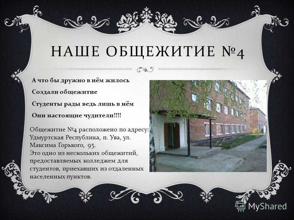 НАШЕ ОБЩЕЖИТИЕ 4 А что бы дружно в нём жилось Создали общежитие Студенты рады ведь лишь в нём Они настоящие чудители !!!! Общежитие 4 расположено по адресу : Удмуртская Республика, п. Ува, ул. Максима Горького, 95. Это одно из нескольких общежитий, предоставляемых колледжем для студентов, приехавших из отдаленных населенных пунктов.