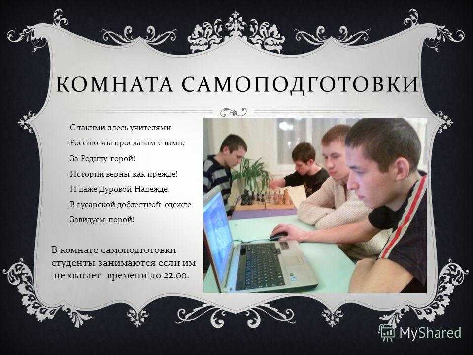 КОМНАТА САМОПОДГОТОВКИ С такими здесь учителями Россию мы прославим с вами, За Родину горой ! Истории верны как прежде ! И даже Дуровой Надежде, В гусарской доблестной одежде Завидуем порой ! В комнате самоподготовки студенты занимаются если им не хватает времени до