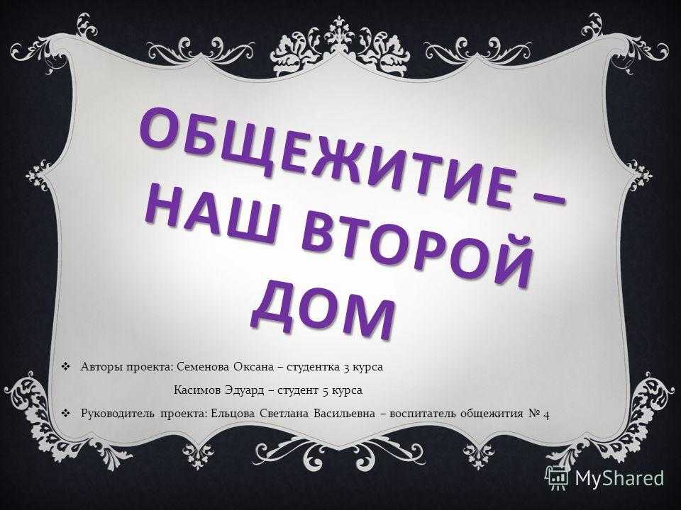 Презентация на тему: » ОБЩЕЖИТИЕ – НАШ ВТОРОЙ ДОМ Авторы проекта : Семенова Оксана – студентка 3 курса Касимов Эдуард – студент 5 курса Руководитель проекта : Ельцова Светлана.» — Транскрипт: