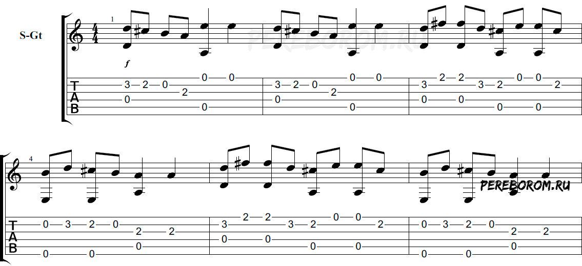 Играем щипком одновременно открытую четвёртую струну (большим правой руки) и вторую (пальцем «a» правой) – 3-2 безым. — сред. (левой) и на 2 третьей переходим средней. Когда играется несколько нот на одной струне (как в этом случае – на 2-ой) – чередуем a-m-a. Не забудьте приглушить бас ре (откр. 4) через четверть, чтобы избежать наслоения открытых 4 и 5.