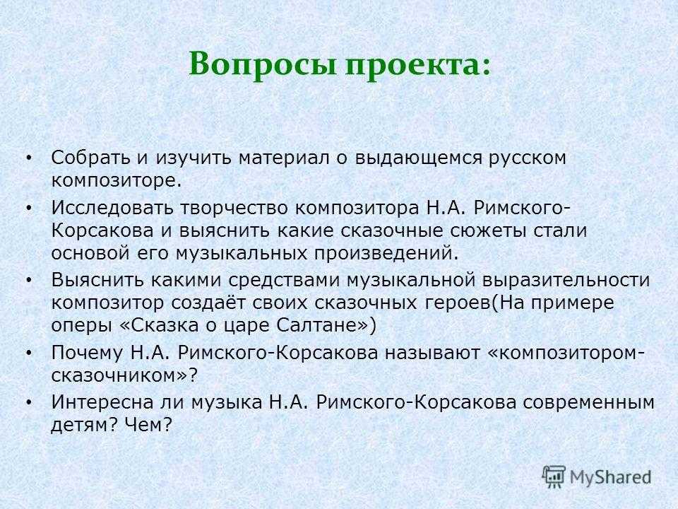 Вопросы проекта: Собрать и изучить материал о выдающемся русском композиторе. Исследовать творчество композитора Н.А. Римского- Корсакова и выяснить какие сказочные сюжеты стали основой его музыкальных произведений. Выяснить какими средствами музыкальной выразительности композитор создаёт своих сказочных героев(На примере оперы «Сказка о царе Салтане») Почему Н.А. Римского-Корсакова называют «композитором- сказочником»? Интересна ли музыка Н.А. Римского-Корсакова современным детям? Чем?