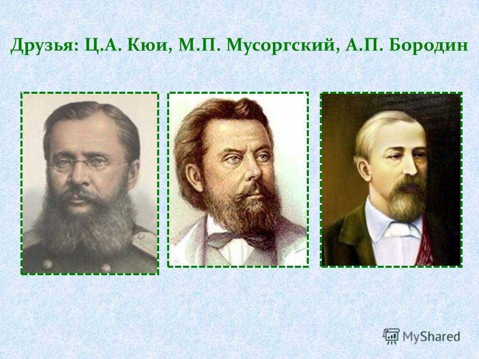 Друзья: Ц.А. Кюи, М.П. Мусоргский, А.П. Бородин