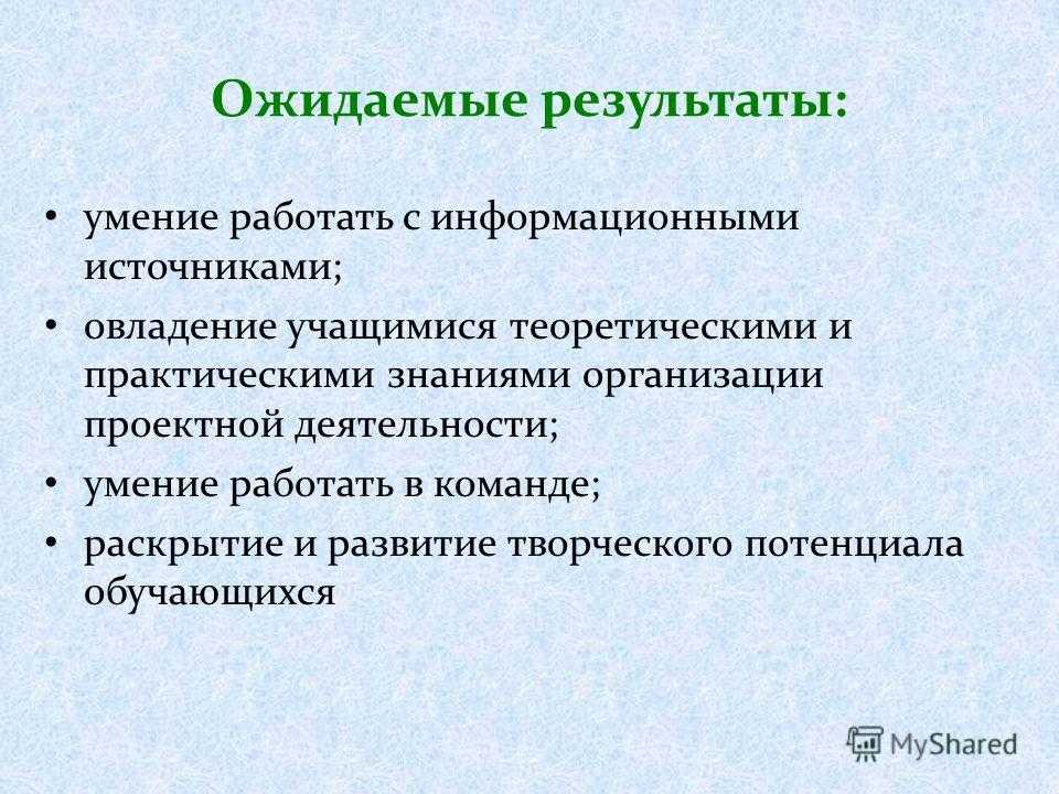 Ожидаемые результаты: умение работать с информационными источниками; овладение учащимися теоретическими и практическими знаниями организации проектной деятельности; умение работать в команде; раскрытие и развитие творческого потенциала обучающихся