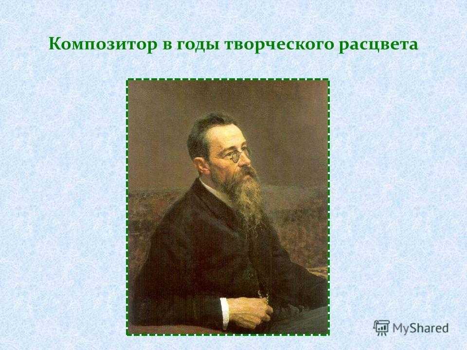 Кроме того, он писал и другие произведения: модные в те времена романсы и восточную сказку «Антар» в форме сюиты. Удивительно, но Римский-Корсаков стал композитором, не имея музыкальный подготовки. Он учился на домашнем обечении, с 6-и осваивал игру на фортепиано, при этом сам больше любил книги, чем музыку. Римский-Корсаков увлекся церковной музыкой и русскими народными песнями позже. Свои первые произведения он написал в 11 лет. Отец отдал его учиться в Морской кадетский корпус. Волей судьбы именно там он понял, что посвятит себя музыке. После смерти отца семья Николая Андреевича переехала в Санкт-Петербург, где Римский-Корсаков вошел в кружок «Могучей кучки».
