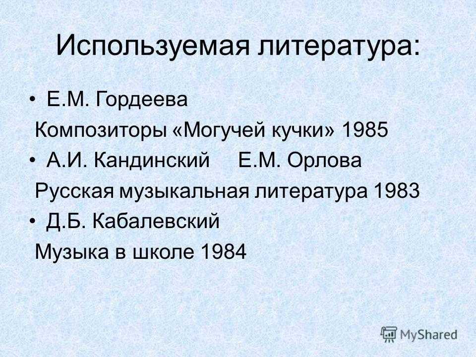 Используемая литература: Е.М. Гордеева Композиторы «Могучей кучки» 1985 А.И. Кандинский Е.М. Орлова Русская музыкальная литература 1983 Д.Б. Кабалевский Музыка в школе 1984