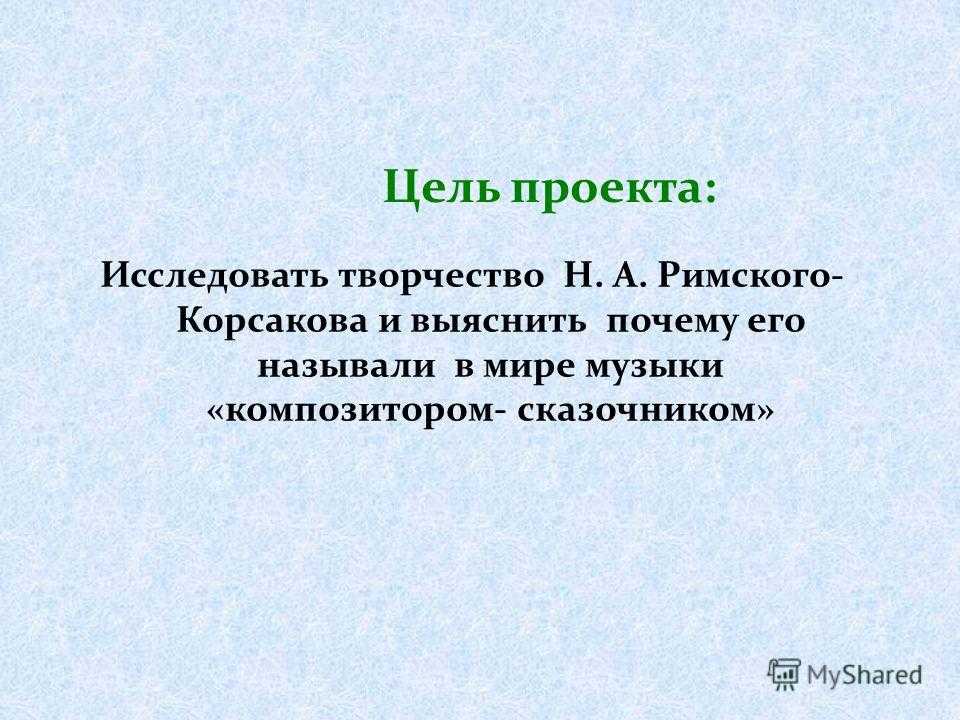 Цель проекта: Исследовать творчество Н. А. Римского- Корсакова и выяснить почему его называли в мире музыки «композитором- сказочником»