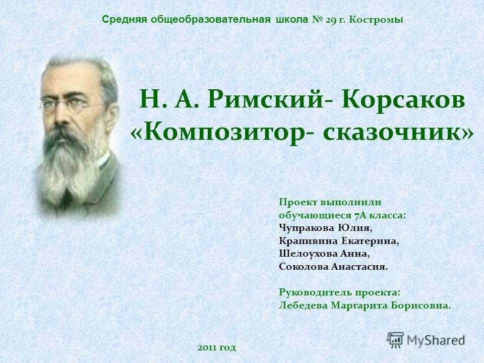 Н. А. Римский- Корсаков «Композитор- сказочник» Проект выполнили обучающиеся 7А класса: Чупракова Юлия, Крапивина Екатерина, Шелоухова Анна, Соколова Анастасия. Руководитель проекта: Лебедева Маргарита Борисовна год Средняя общеобразовательная школа 29 г. Костром ы