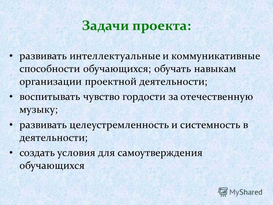 Задачи проекта: развивать интеллектуальные и коммуникативные способности обучающихся; обучать навыкам организации проектной деятельности; воспитывать чувство гордости за отечественную музыку; развивать целеустремленность и системность в деятельности; создать условия для самоутверждения обучающихся