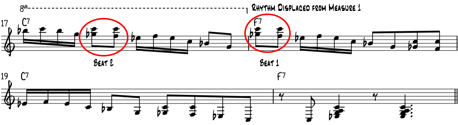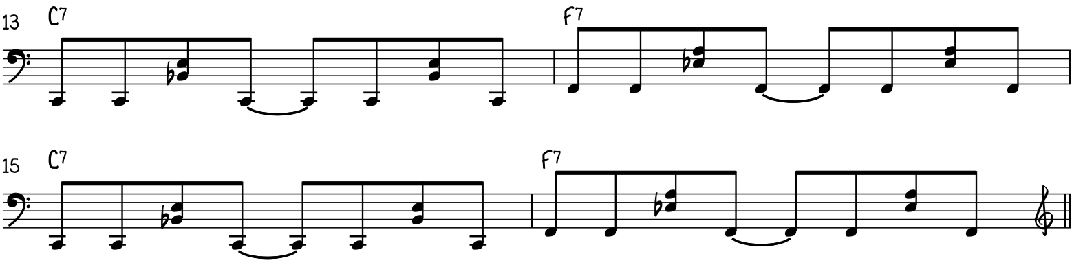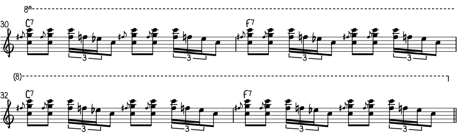 Часть материала перерабатывается из промежуточного рифа № 2. Хотя в этом мы используем более крупные аккорды, чтобы гармонизировать ноты на долях 2 и 4, и большие блюзовые обороты между долями 1 и 3. Это также повторяющийся рифф, который играет на протяжении всей последовательности одинаково, что является общей тенденцией. в стиле: