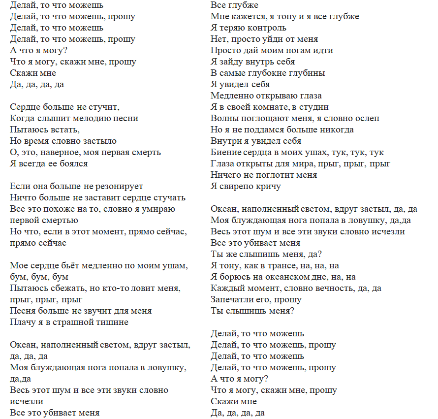 Занимайся своим делом, Занимайся своим делом, со мной. Занимайся своим делом, Занимайся своим делом, со мной. Чем является мое дело? Чем является мое дело, скажи мне? Скажи мне (да-да-да-да) (Эй) Они говорят ‘Сердце больше не бьется, Когда слышу, как играет музыка. Пытаюсь собраться. Кажется, будто время остановилось.’ О, это было бы моей первой смертью, Той, которой всегда боялся. Если это больше не вызывает чувств, Больше не заставляет сердце трепетать, То это может быть тем, как я впервые умру. Но что, если этот момент происходит сейчас? Прямо сейчас. Медленно пульсирующее сердцебиение отдается в ушах, Бум бум бум, Несмотря на то, что пытаюсь сбежать, снова падаю в пасть, Прыжок, прыжок, прыжок. Ни одна песня больше не действует на меня, Кричу, не издавая ни звука. Океан с полностью погасшими огнями (да-да-да) Хватает меня за мои блуждающие лодыжки, (да-да-да) Все звуки и шумы были отрезаны от меня. (да-да-да) Это убивает меня, убивает меня, Слышишь меня? (да) Медленно тону, будто я в трансе. (нет-нет-нет) Борюсь, но вокруг лишь дно океана. (нет-нет) Каждый момент растягивается в вечность. (да-да-да) Заснимите же это, заснимите это, Слышите меня? Занимайся своим делом, Занимайся своим делом, со мной. Занимайся своим делом, Занимайся своим делом, со мной. Чем является мое дело? Чем является мое дело, скажи мне? Скажи мне. (да-да-да-да) Глубже. Да, кажется, погружаюсь глубже. Продолжаю терять фокус, Нет, просто отпусти меня, Позволь моим ногам нести меня, Я сам зайду В самые глубины, И там я увидел себя. Медленно открываю глаза, Я в своем рабочем кабинете, Это моя студия. Суровые волны мрачно проходят мимо, Но снова им меня не затянуть, Внутри я увидел себя, самого себя. Медленно пульсирующее сердцебиение отдается в ушах, Бум, бум, бум. С широко раскрытыми глазами в этот лес я Прыгаю, прыгаю, прыгаю, Ничто не сможет поглотить меня. Я свирепо выкрикиваю: Океан с полностью погасшими огнями (да-да-да) Хватает меня за мои блуждающие лодыжки. (да-да-да) Все звуки и шумы были отрезаны от меня, (да-да-да) Это убивает меня, убивает меня, Слышишь меня? (да) Медленно тону, будто я в трансе. (нет-нет-нет) Борюсь, но вокруг лишь дно океана. (нет-нет) Каждый момент растягивается в вечность, (да-да-да) Заснимите же это, заснимите это, Слышите меня? (да) Занимайся своим делом, Занимайся своим делом, со мной. Занимайся своим делом, Занимайся своим делом, со мной. Чем является мое дело? Чем является мое дело, скажи мне? Скажи мне (да-да-да-да)