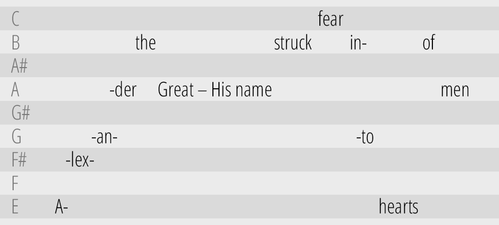 В композиции «Alexander the Great» слова часто путаются, а рифмы отсутствуют. Единственный момент, который помогает прочувствовать мелодию — это припев. В нем мало слов. Солист может тянуть гласные и создавать более структурированную, певучую мелодическую линию.