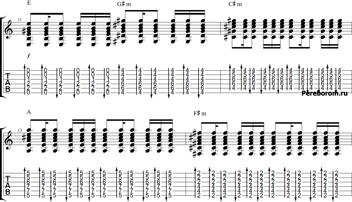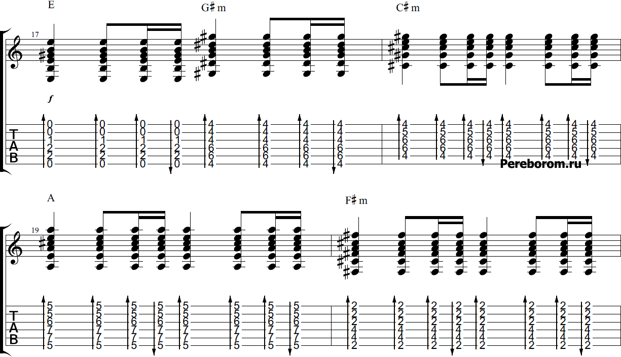 Кроме того, обратите внимание на то, что аудиофайлы и табы демонстрируют только первые четыре такта, однако, проведя аналогию, вы без труда сыграете и все остальное, поскольку на припеве бой никак не меняется.