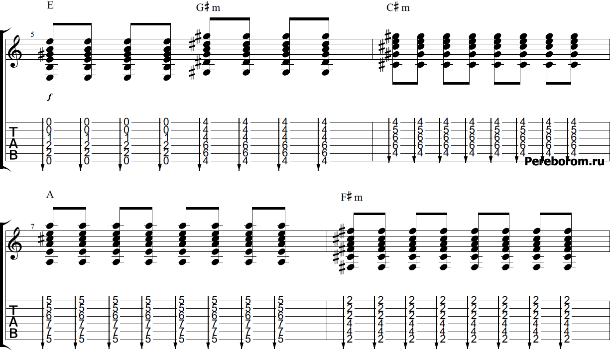 Кроме того, обратите внимание, что все аккорды, использующиеся в песне, мы подобрали с использованием баррэ. Дело в том, что именно так песню играть проще всего – иначе придется постоянно скакать по грифу, что негативно скажется на звучании