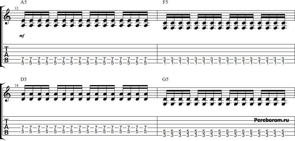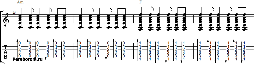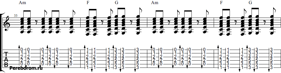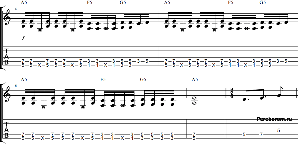 На электрогитаре припев играется даунстроуком – то есть постоянными ударами вниз в позициях квинтовых аккордов.
