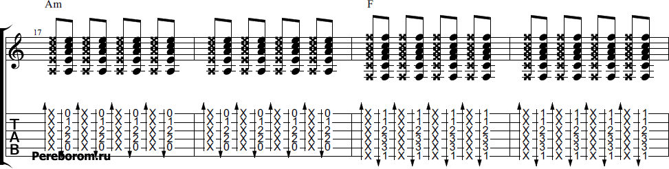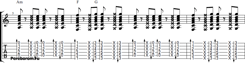 Кроме того, припевную часть также можно сыграть боем «Регги». Этот пример хорошо будет дополнять 2-ой вариант боя для куплета с глушением. Основное отличие данного ритма, вы начинаете играть его с глушения струн и делайте акцент на второй удар вверх. Таким образом, обыгрываются все аккорды припева. Здесь самое главное держать темп и не сбиваться в ударах, так вы получите интересный звук и разнообразите свою игру.