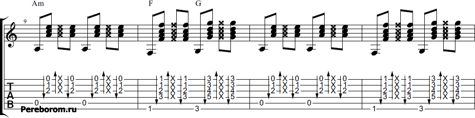 Этот способ играть «Лесник» на гитаре подойдет любителям боя с глушением. Выглядит он следующим образом.